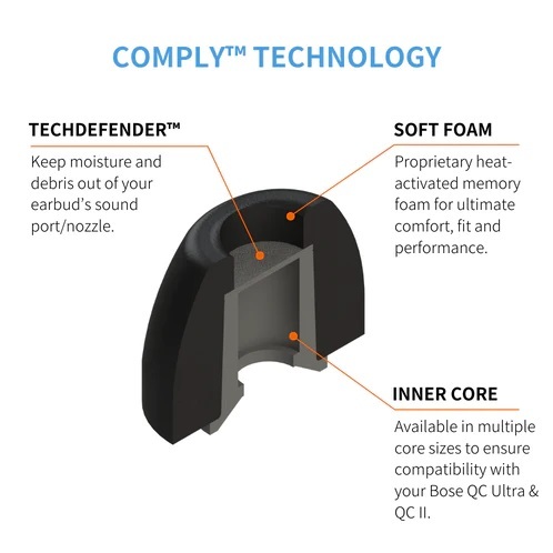 Engineered specifically for your Bose QuietComfort II and Bose QuietComfort Ultra earbuds, Comply ear tips are tailored to help you achieve maximum audio quality without worrying about repositioning and noise hindrances. Empower your listening experience with the renowned audio quality of the Bose brand with a confidence boost in wearing your earbuds.