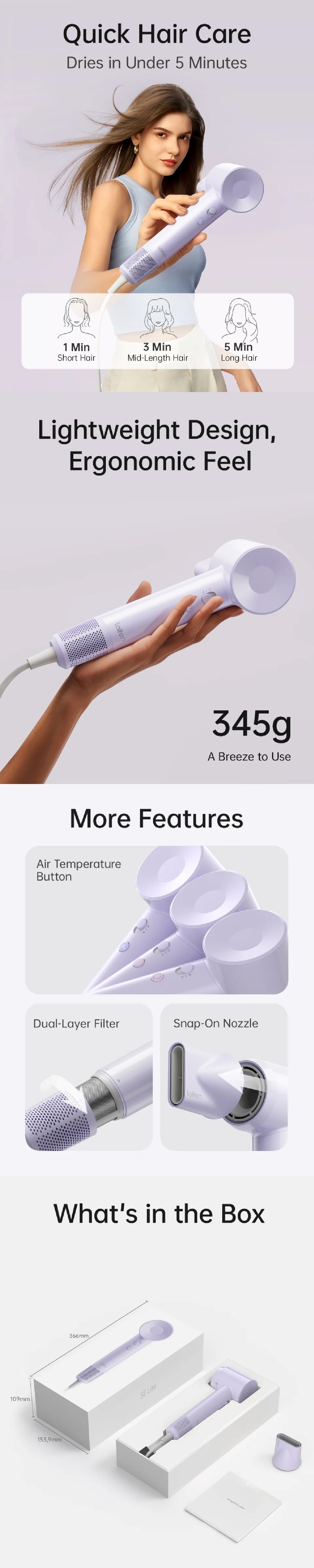 The SE Lite delivers smooth 19m/s airflows that can dry hair in as short as one minute depending on your hair length.