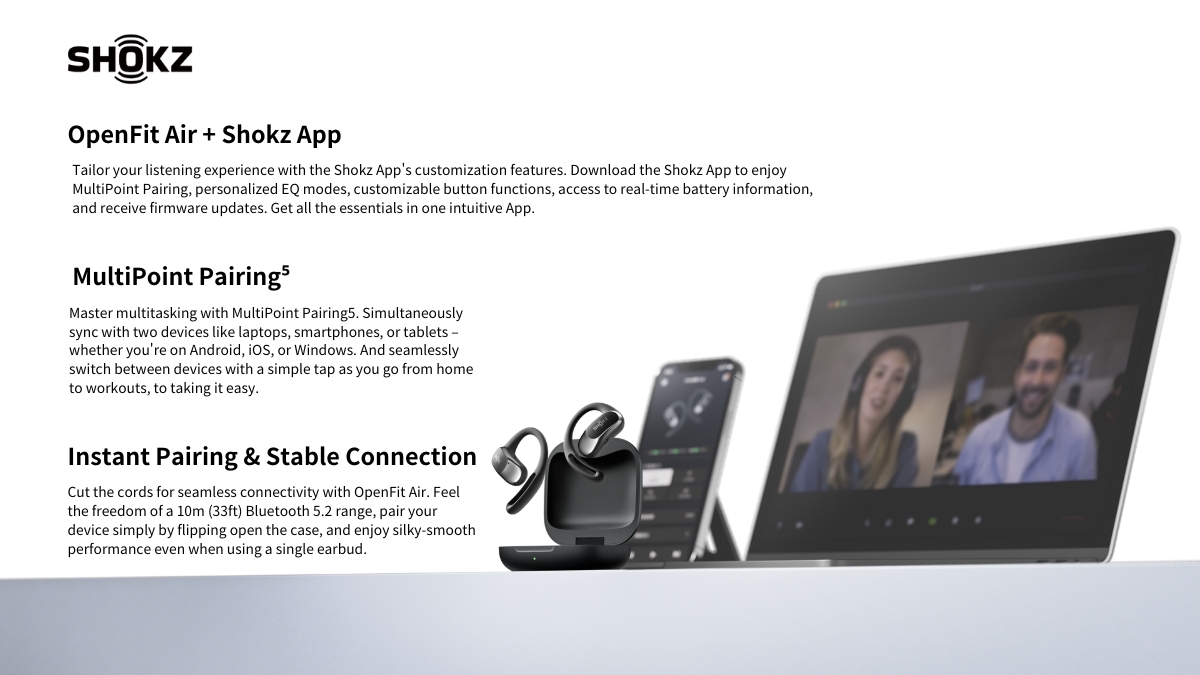 5. MultiPoint Pairing is disabled by default and can be activated in the Shokz App. The headphones can memorize up to 5 devices.