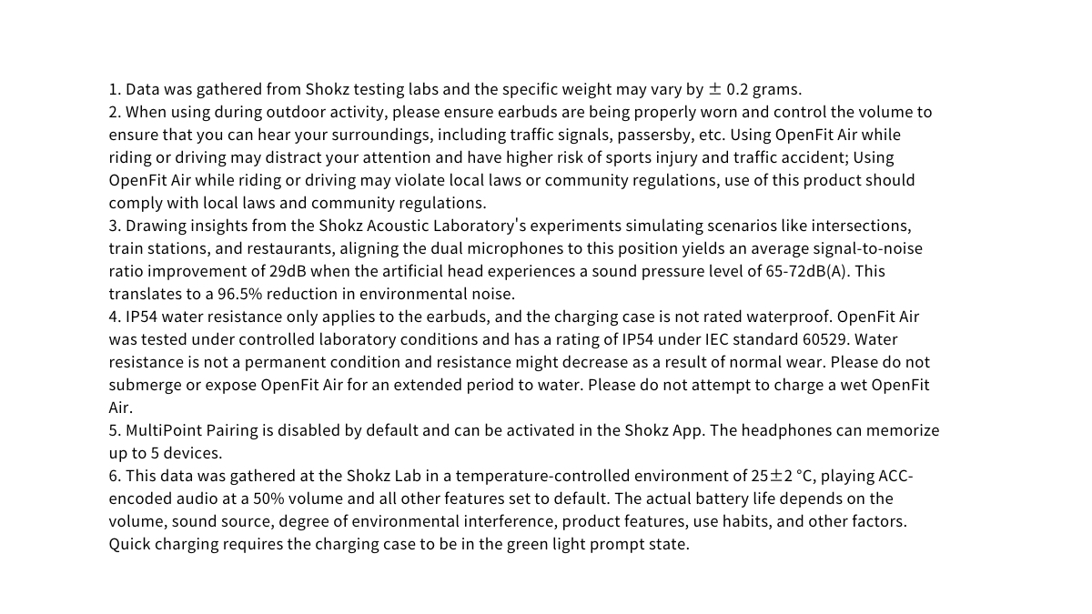 1. Data was gathered from Shokz testing labs and the specific weight may vary by ± 0.2 grams.