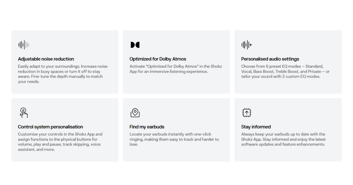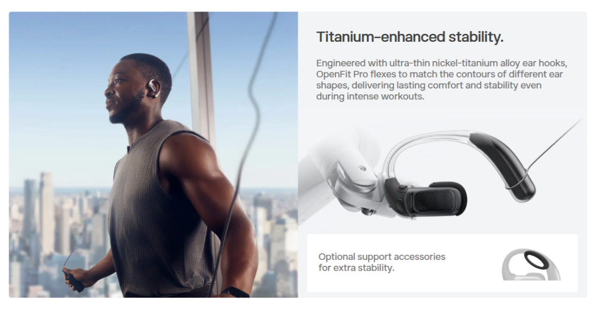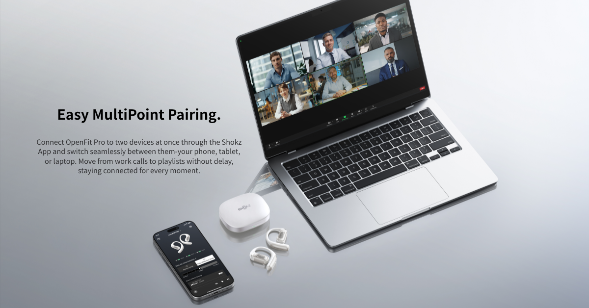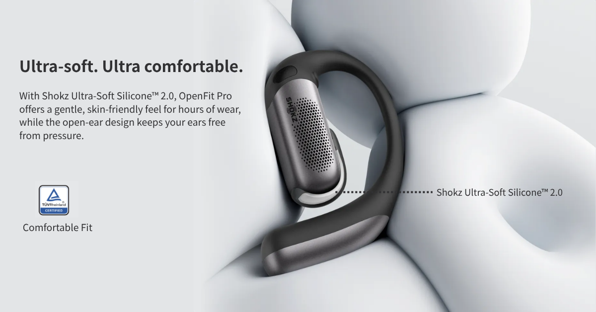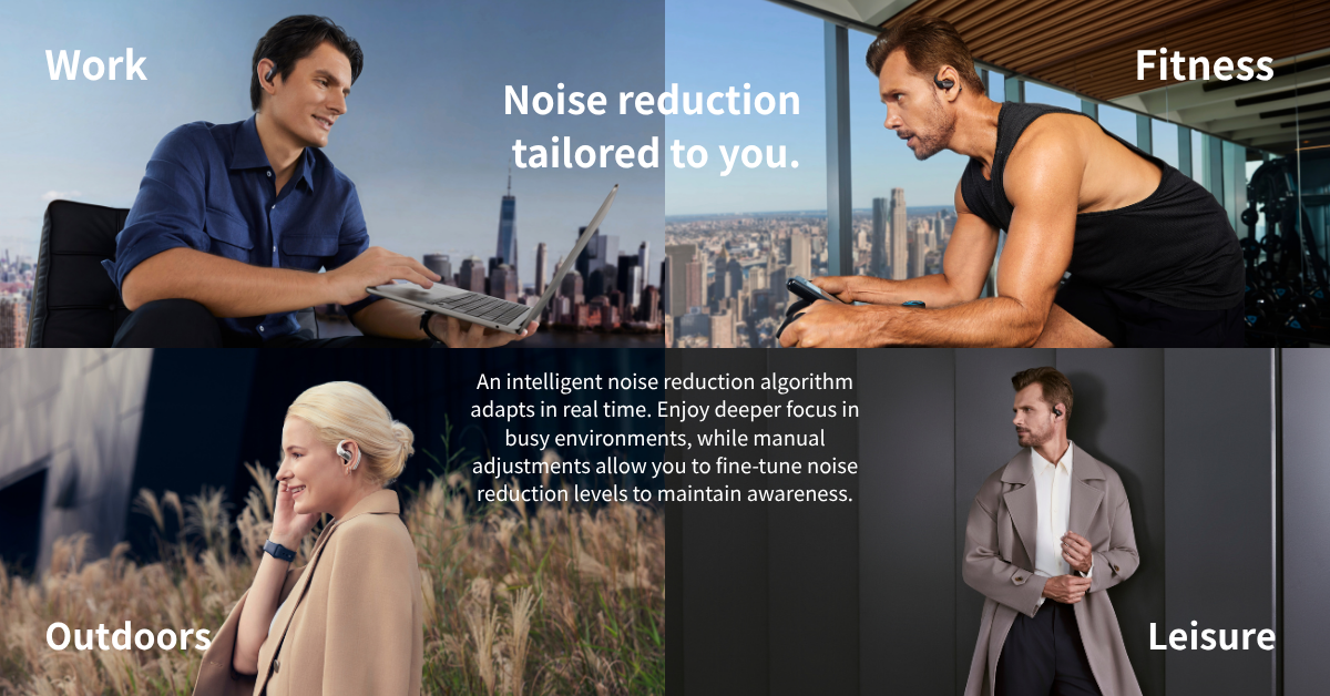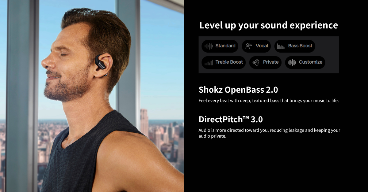 *Shokz OpenFit Pro features AI noise reduction technology designed to reduce environmental noise while preserving human voices. Internal simulations conducted by Shokz Lab suggest that this technology can achieve a signal-to-noise ratio improvement of approximately 42 dB, corresponding to a potential 99.4% reduction in ambient noise, along with effective reduction of loud echoes. Note that actual performance may vary depending on environmental conditions.
