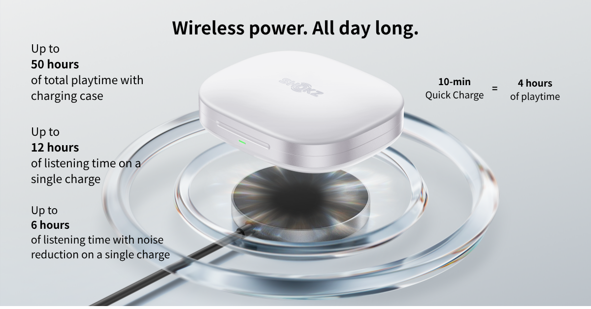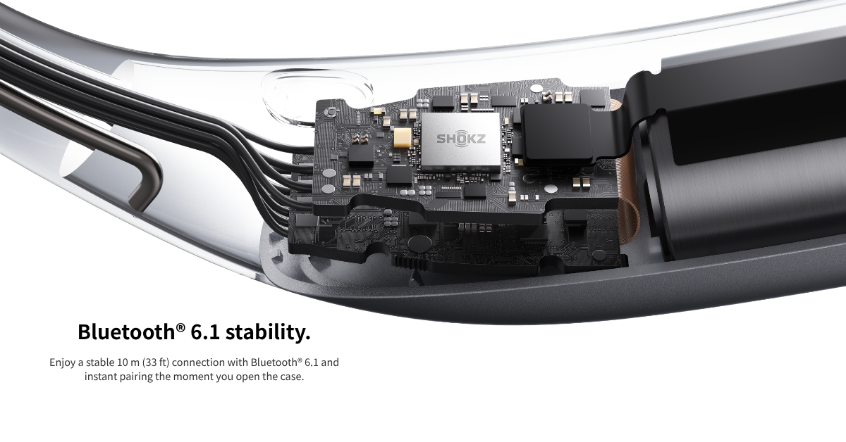 *Tested at the Shokz Lab under controlled conditions at 25 ± 2 °C with a standard power adapter. A 10-minute charge in the charging case delivers the earbud approximately 4 hours of music playback, based on AAC-encoded audio played at 50% volume with Noise Reduction and other special audio features turned off. Actual performance may vary depending on device settings, volume level, audio source, environmental interference, features enabled, usage habits, and other factors.