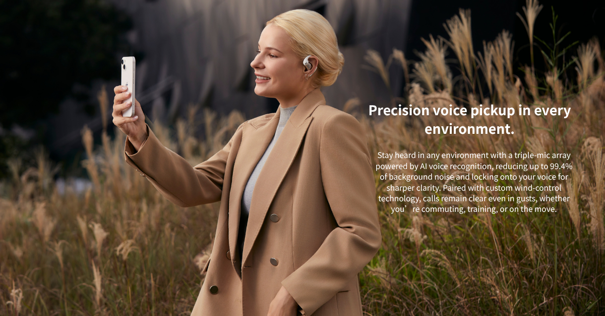 *Internal testing conducted by Shokz Lab using a low-noise fan to create a stable wind noise environment, with the headset worn on a speaking artificial head to test call quality at 15 km/h in an anechoic chamber. However, real-world conditions may vary, and wind noise reduction may be less effective in different environments.