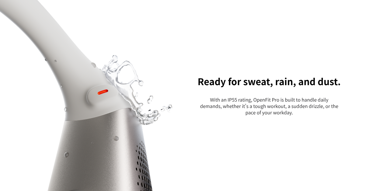 *IP55 water-resistance only applies to the earbuds, and charging case is not rated waterproof. OpenFit Pro is resistant to sweat and water splashes, suitable for non-aquatic sports and activities. Under specific testing conditions, its waterproof performance has reached the IP55 level based on the IEC 60529 standard. The sweat and waterproof capability is not permanent and may decrease over time due to wear and tear. DO NOT charge a wet OpenFit Pro, nor swim or shower with it.