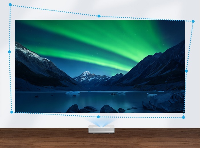 支援光學及智能自動調焦、四點梯形校正外再加8點雙軸曲面校正,加上內建安裝輔助功能,即使不小心移動位置,也能自行調整出清晰精准的畫面品質