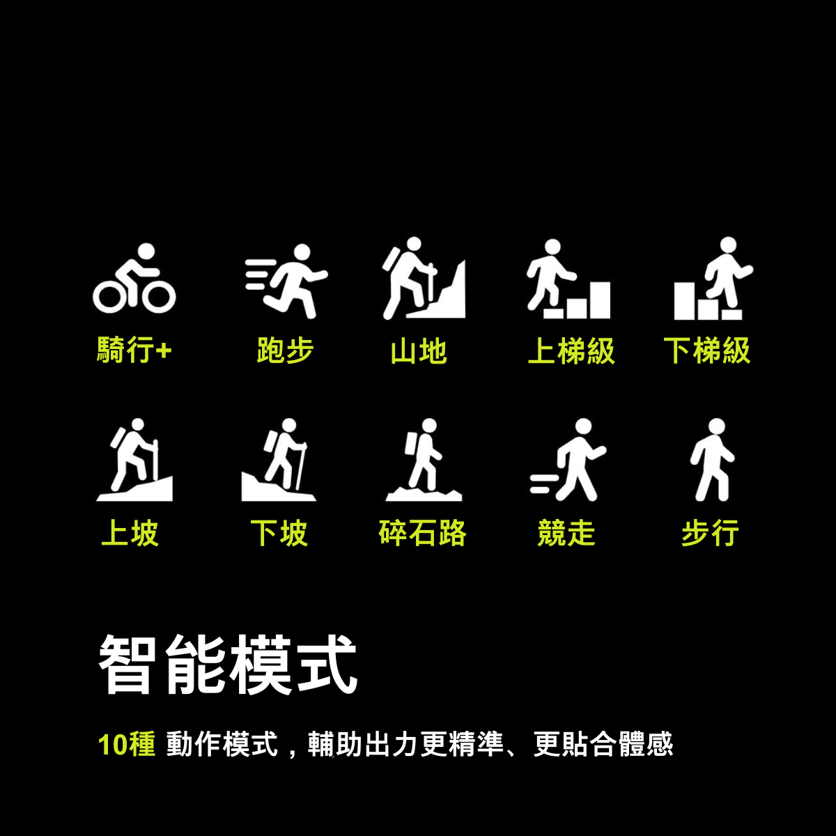 智能模式: 騎行、跑步、下梯級、上梯級、競走、下坡、上坡、山地、碎石路及步行