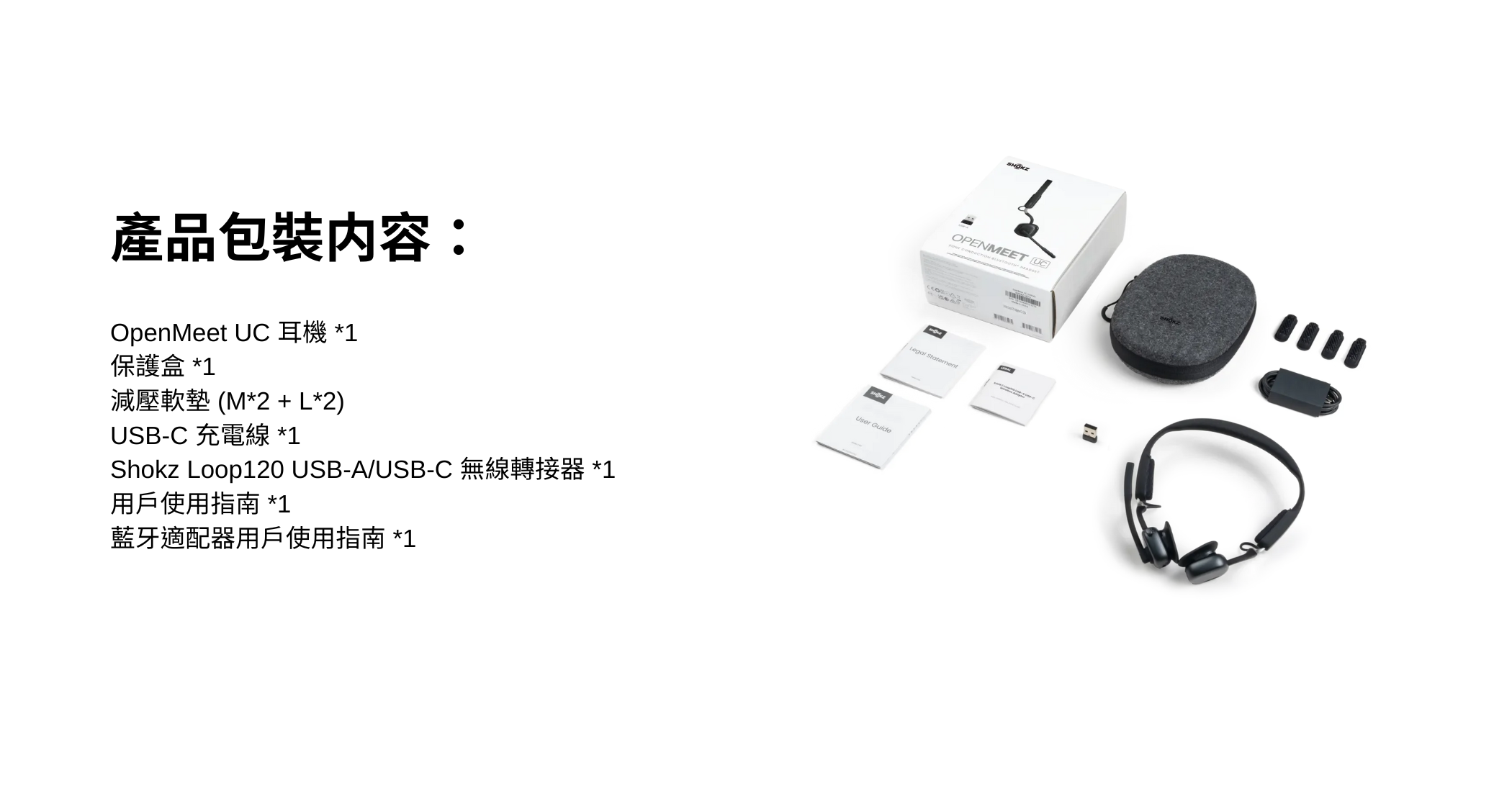 Shokz OpenMeet UC 開放式藍牙通訊耳機採用品牌標誌性的開放式耳機設計,徹底解決傳統入耳式及耳罩式耳機所帶來的不適與悶熱,提供全天候的舒適聆聽體驗。配備長達 15 小時的電池續航力與快速充電功能,並搭載DualPitch™ 雙單元技術以呈現卓越音質。此外,雙MIC 系統有效降噪,降噪率高達 98.6%,即使身處繁忙環境,也能保持清晰溝通。✅開放式設計✅僅重78g ✅創新的5點式設計✅提供3種尺寸的可互換減壓軟墊 ✅長達15小時續航力 + USB-C快速充電✅DualPitch™ 雙單元技術✅雙MIC系統降噪率高達 98.6%*香港原裝行貨,1年保養