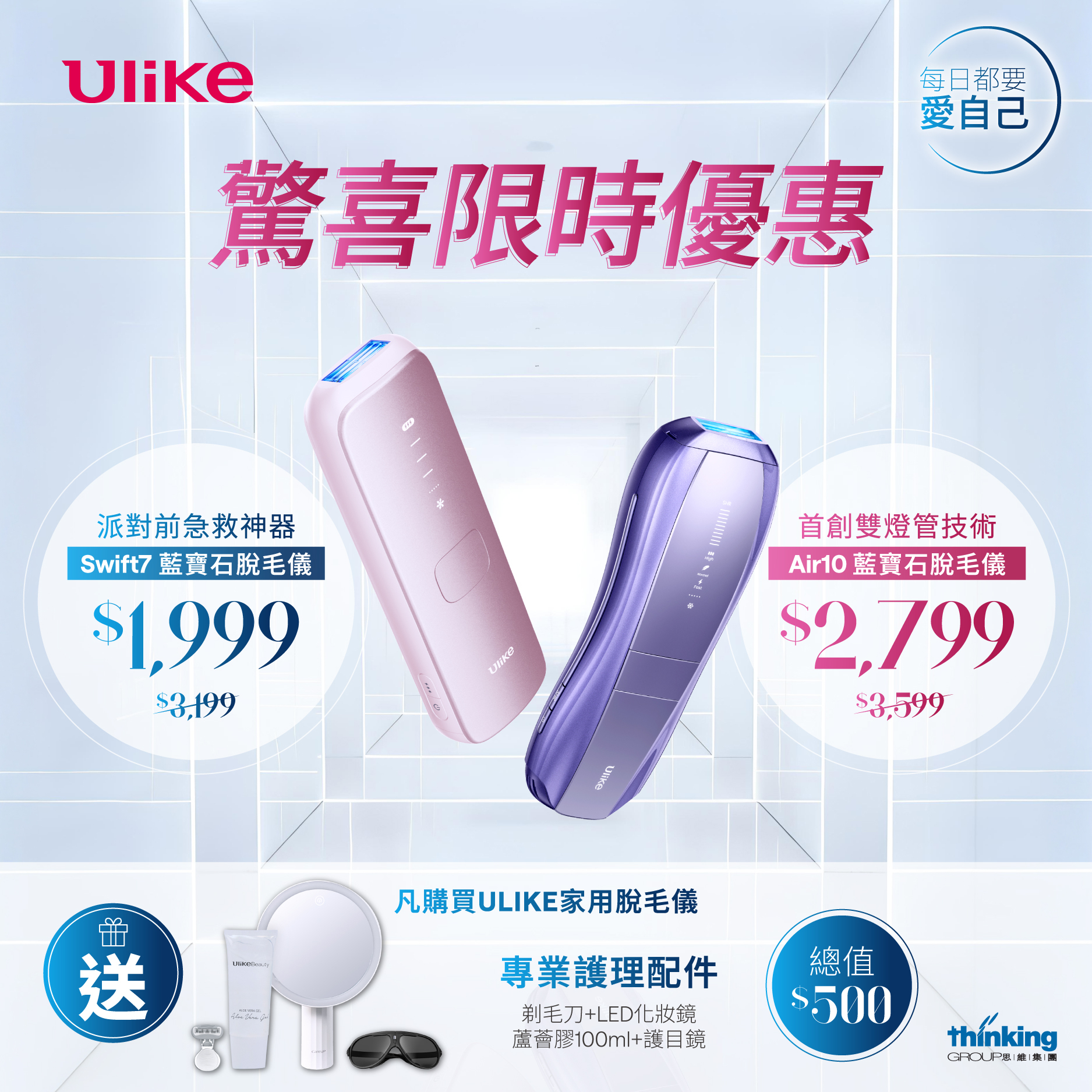 指定商品,ULIKE Gift Set A 限時禮遇:蘆薈膠100ml*1 + LED化妝鏡*1 + 剃毛刀*1 + 護目鏡*1