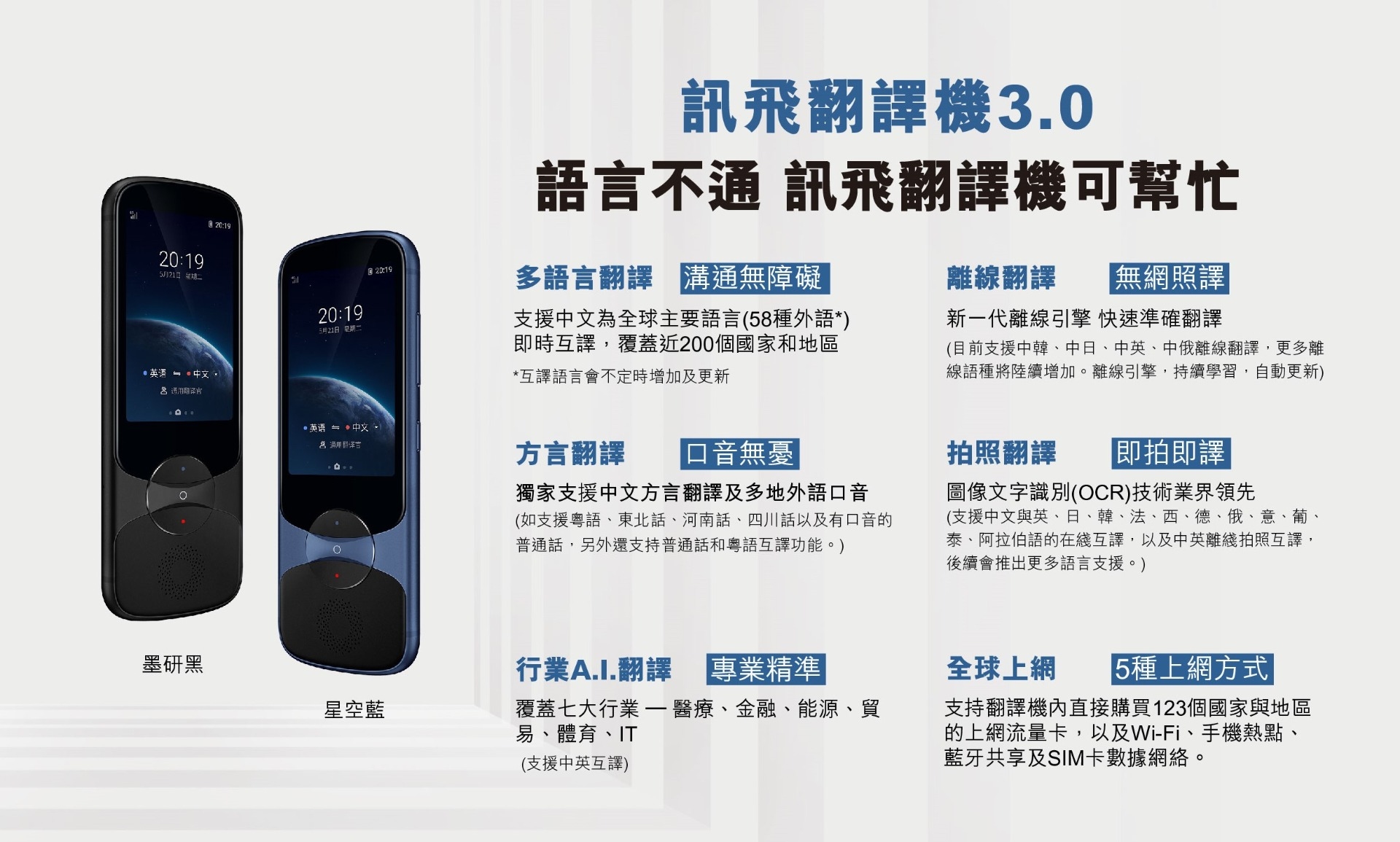 ● 全球上網 5種上網方式,支援翻譯機內直接購買123個國家與地區的上網流量卡,以及Wi-Fi、手機熱點、 藍牙共享及SIM卡數據網絡。